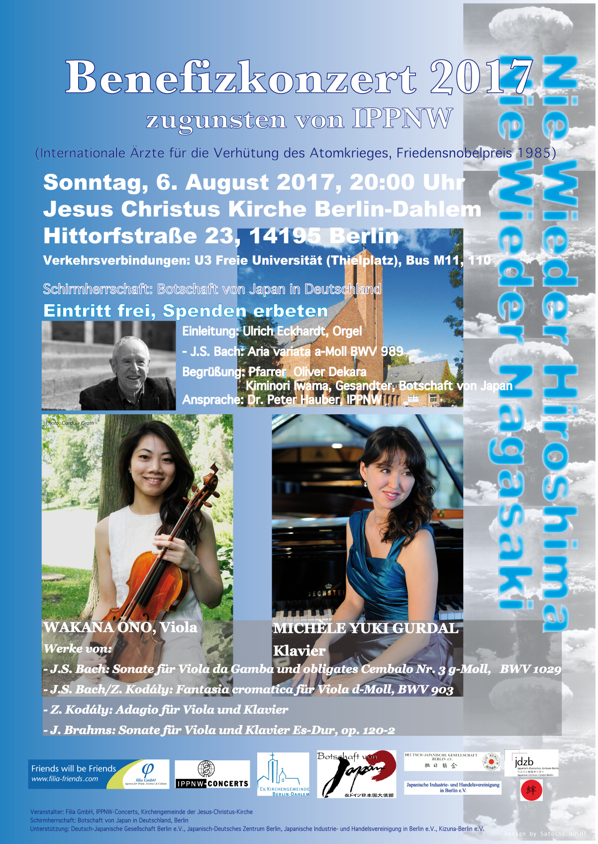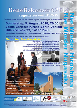 2017年8月6日、ベルリン・ダーレム地区イエス・キリスト教会で開催された「ノーモアヒロシマ・ノーモアナガサキ」、IPPNW(核戦争防止国際医師会議)のためのチャリティコンサートには、約500名のお客様がいらして下さいました。